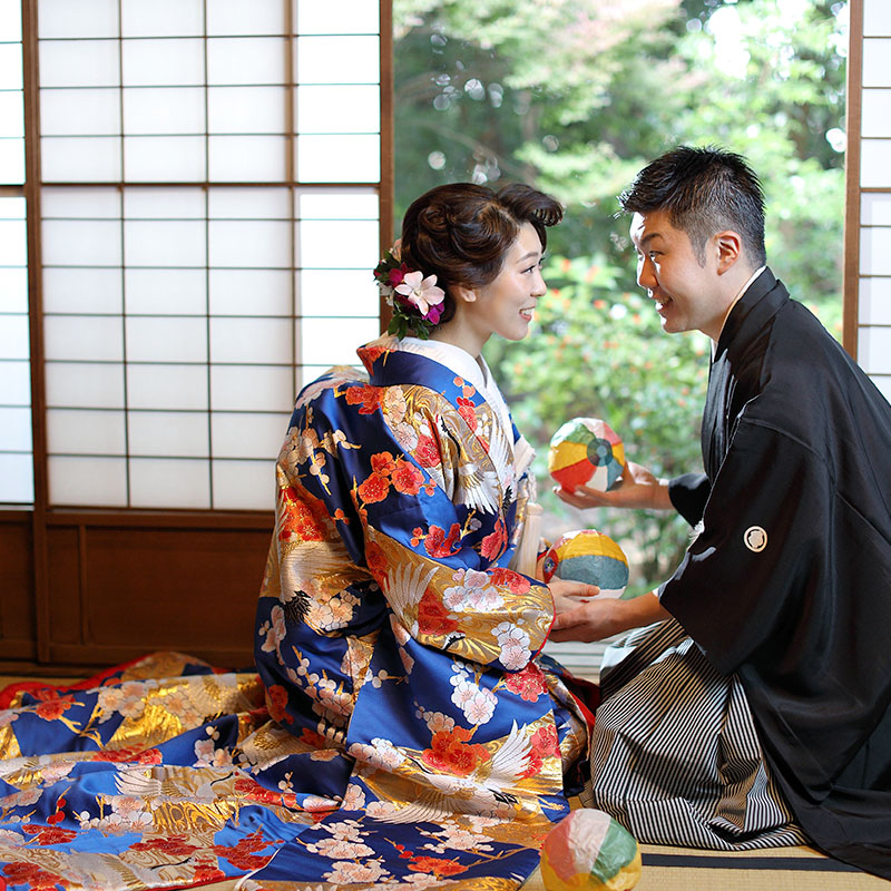 | <ご新郎様> 紋付袴 <ご新婦様> 白無垢または色打掛 |